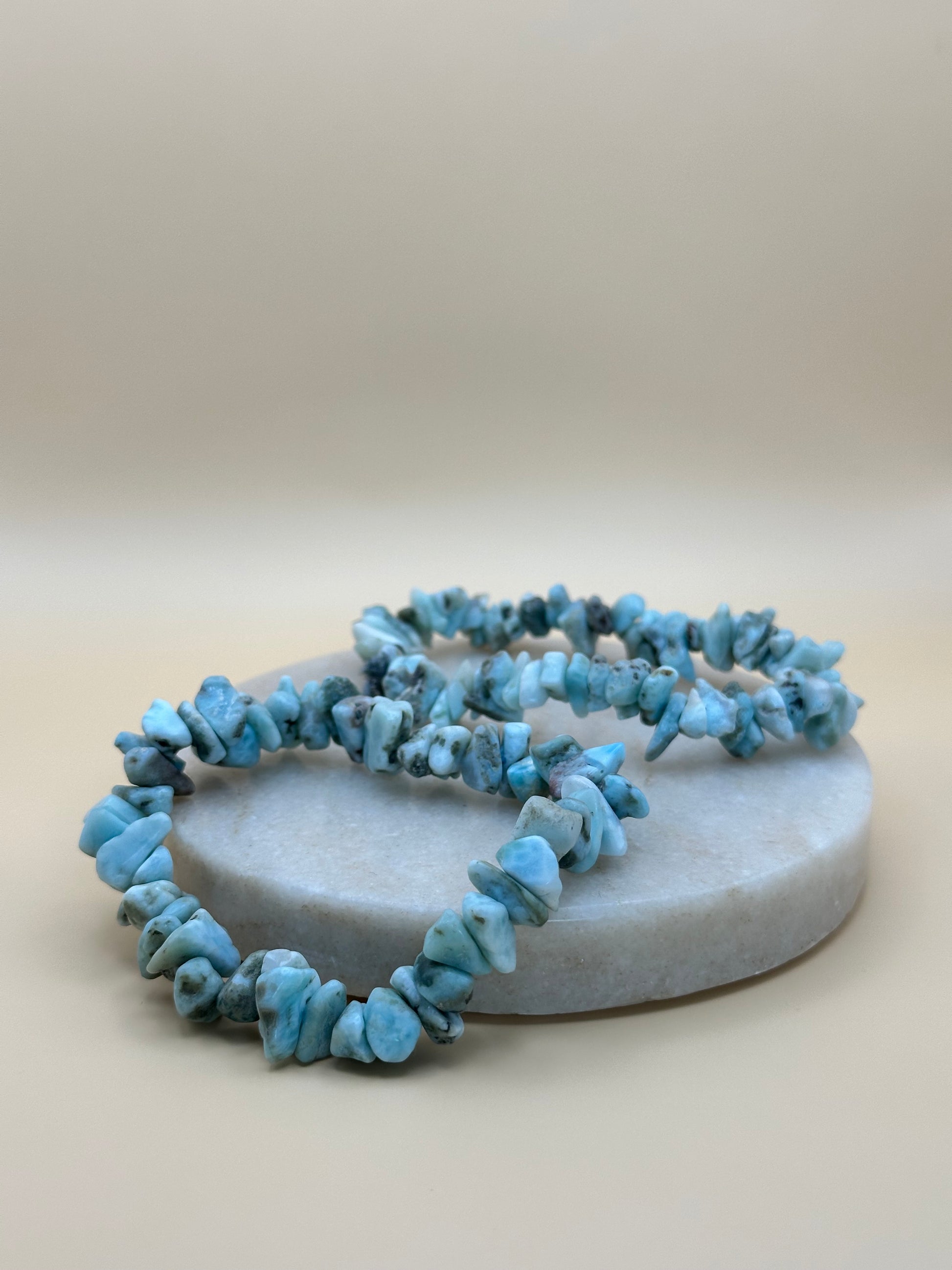 Dieses Splitterarmband aus Larimar fördert friedliche Kommunikation, Selbstbewusstsein und innere Ruhe. Mit seinen bezaubernden blauen Tönen erinnert es an den Ozean und hilft, emotionale Blockaden zu lösen und das Halschakra zu öffnen.
